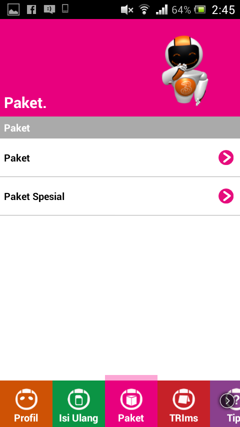 Aplikasi pertama di Indonesia dengan ‘push notification’ yang bisa ngingetin waktunya isi ulang kuota. Isi ulang jadi mudah karena bisa langsung dari gadget. BIMA juga bisa menampilkan info seputar profil Tri kamu dan memberi rekomendasi paket yang sesuai kebutuhan.