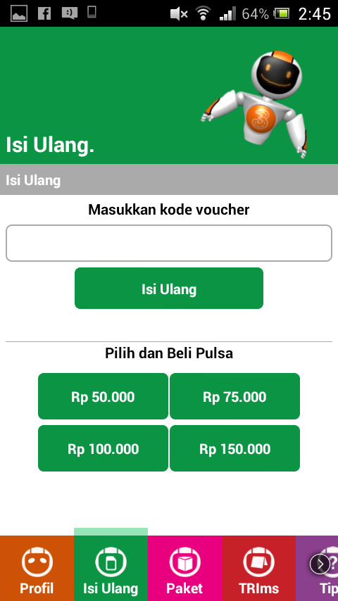 2. Isi ulang kuota/pulsa. Isi ulang kuota/pulsa jadi mudah, melalui: Voucher fisik dengan memasukkan kode voucher-nya. Online dengan debit/credit card.