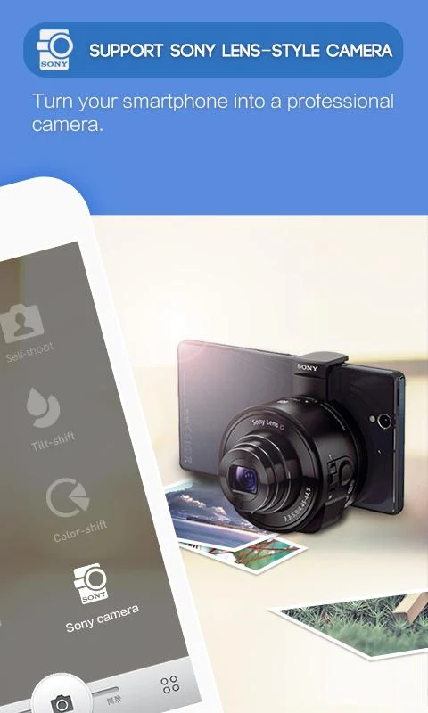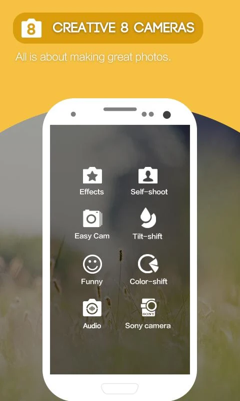- 8 kamera yang meliputi: Kamera Easy, Sony Camera, Efek Kamera, potret diri Camera, Kamera Lucu, Tilt-shift Camera, Color-shift Kamera, Audio Camera dan banyak lagi!